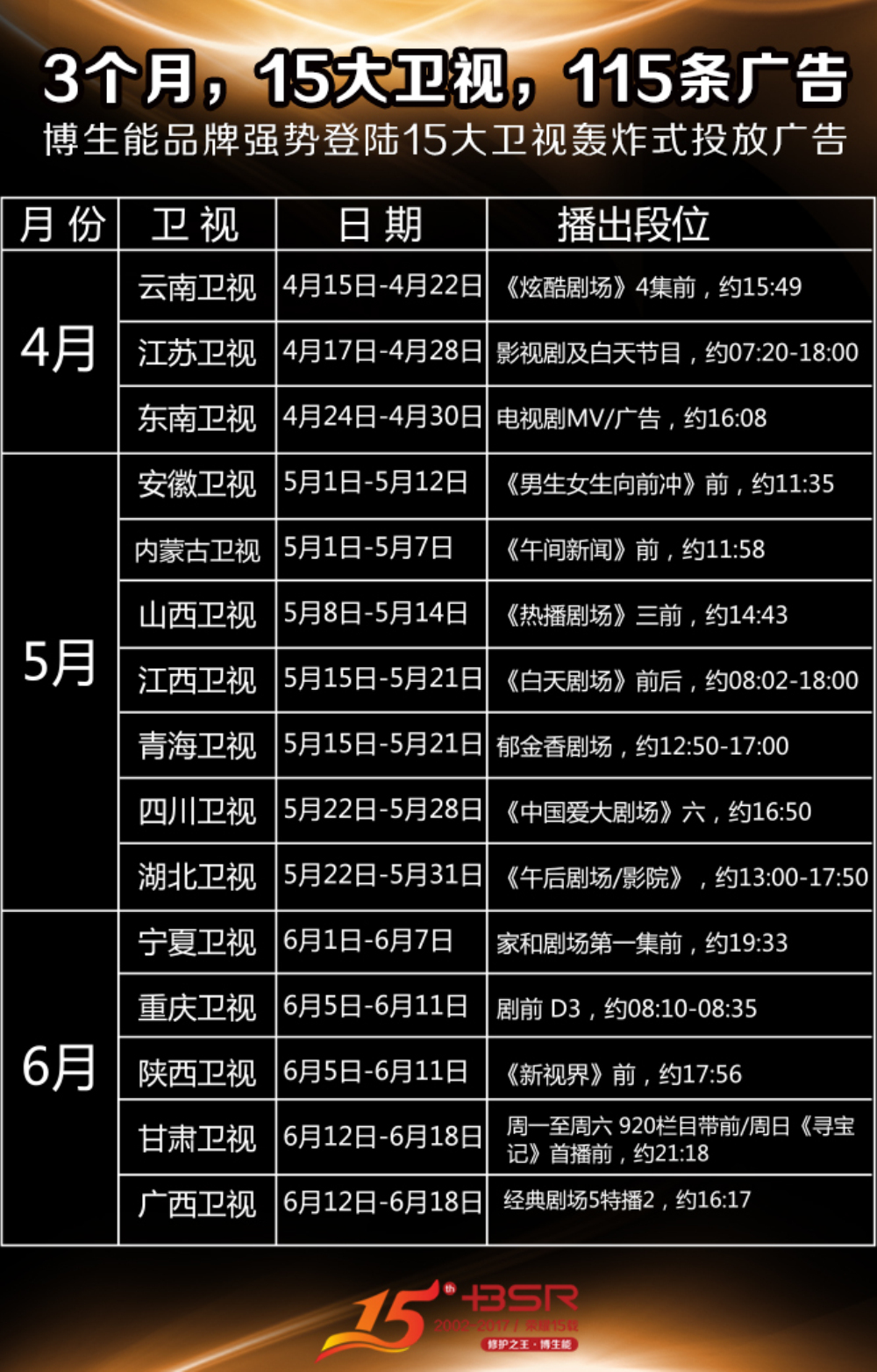 修护专家博生能,值此2017年15周年之际,将强势登陆云南卫视、江苏卫视、东南卫视、安徽卫视、内蒙古卫视、山西卫视、江西卫视、青海卫视、四川卫视、湖北卫视、重庆卫视、宁夏卫视、陕西卫视、甘肃卫视、广西卫视15大卫视,从2017年4月15日-6月18日开展跨时3个月、总共115次的广告投放。