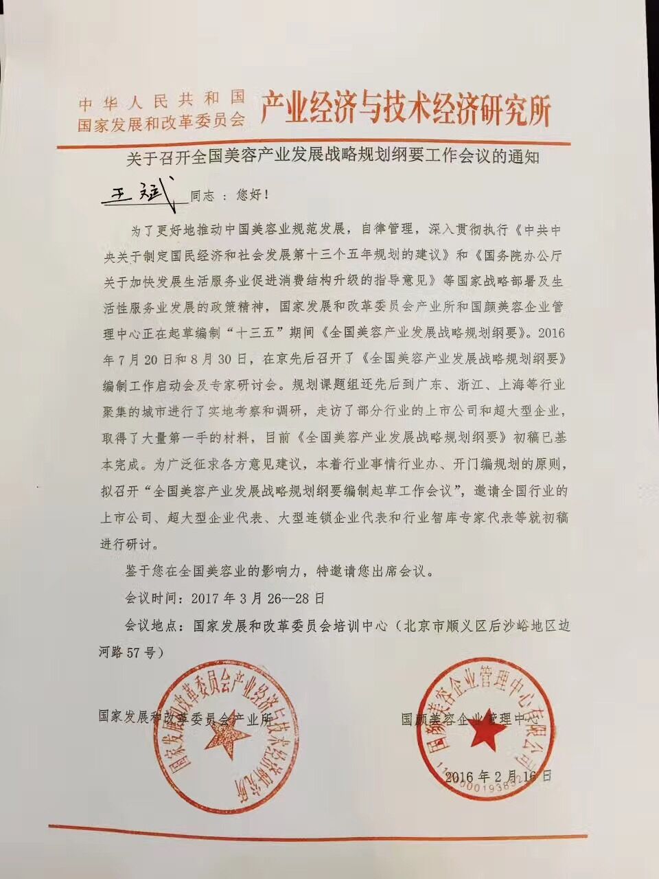 2017年3月26日-3月28日,广州雅盈投资管理有限公司董事总经理王斌先生,受邀出席国家发改委产业经济研究所在北京·国家发改委培训中心主办的《全国美容产业发展战略规划纲要》工作会议,并在会议中担任D组领导,与出席代表们共同研讨美容行业发展规划!